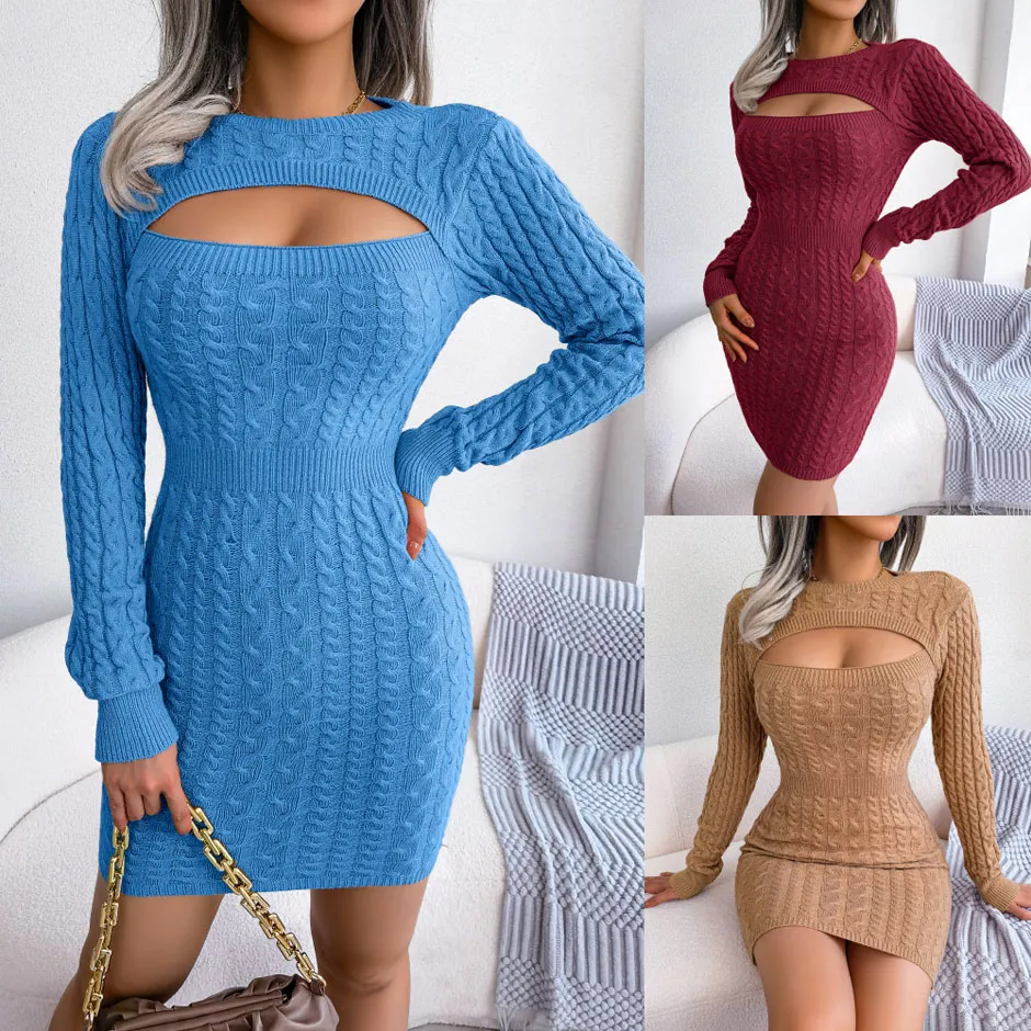Fried dough twist waist wrap hip skirt is sexy and fashionable.High waist cut out off collar design, solid color fitted dress.